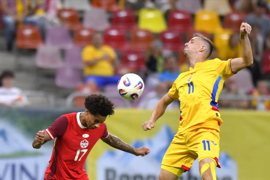 Nicusor Bancu (D), de la echipa nationala a Romaniei, lupta pentru balon cu Tajon Buchanan (S), de la selectionata Canadei, in amicalul de fotbal disputat pe Arena Nationala din Bucuresti, vineri, 5 septembrie 2025. ALEXANDRU DOBRE / MEDIAFAX FOTO