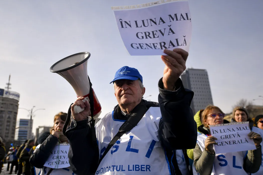 Membrii Federatiei Sindicatelor Libere din Invatamant, Federatiei Sindicatelor din Educaţie „Spiru Haret” si Federatiei Nationale Sindicale „Alma Mater”, protesteaza in Piata Victoriei impotriva masurilor fiscale adoptate de Guvern, miercuri 4 februarie 2025. ALEXANDRU DOBRE / MEDIAFAX FOTO