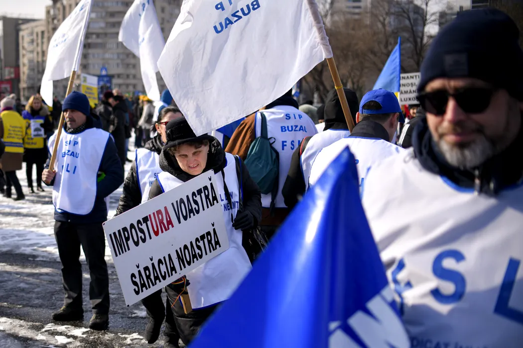 Membrii Federatiei Sindicatelor Libere din Invatamant, Federatiei Sindicatelor din Educaţie „Spiru Haret” si Federatiei Nationale Sindicale „Alma Mater”, protesteaza in Piata Victoriei impotriva masurilor fiscale adoptate de Guvern, miercuri 4 februarie 2025. ALEXANDRU DOBRE / MEDIAFAX FOTO
