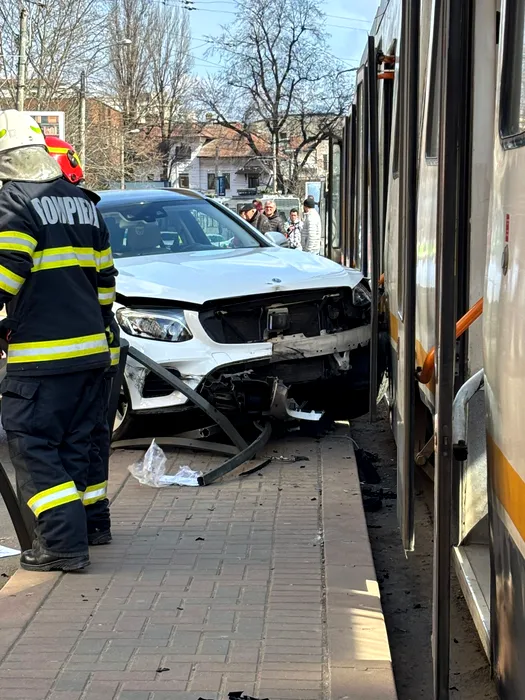 Spulberați de o mașină în timp ce așteptau într-un refugiu de tramvai. Șoferul a intrat în plin în pietoni și în tramvai