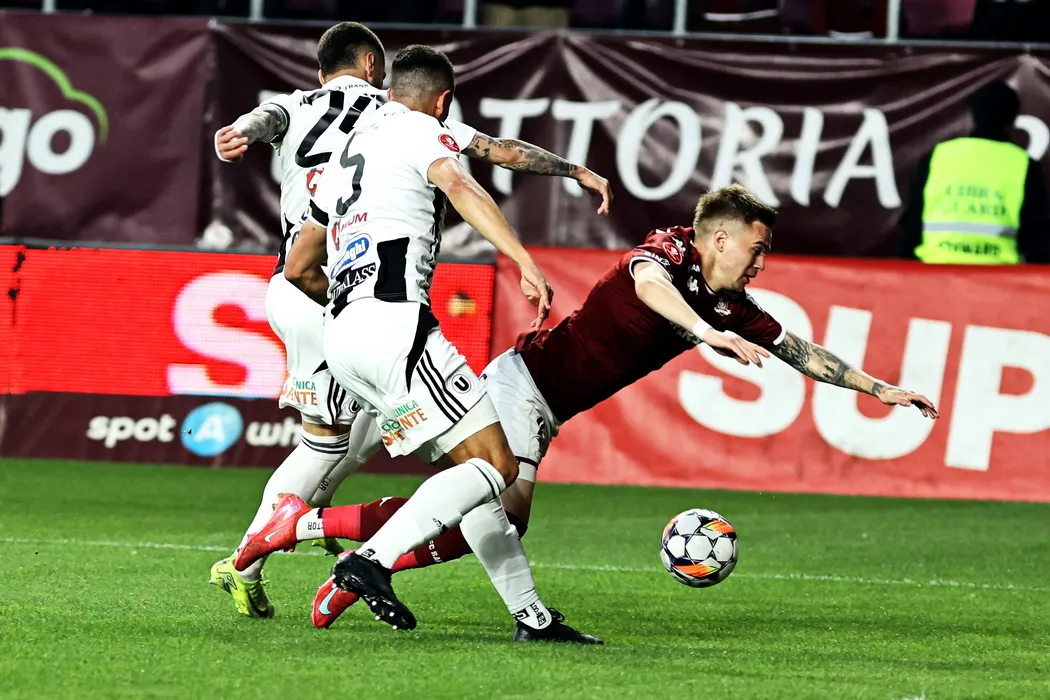 Claudiu Petrila (D), de la Rapid, suteaza in timpul meciului de fotbal contra echipei Universitatea Cluj din etapa 5 a play-off-ului Superligii, disputat pe stadionul Rapid-Giulesti din Bucuresti, sambata, 19 aprilie 2025. GEORGE FLUSTER / MEDIAFAX FOTO