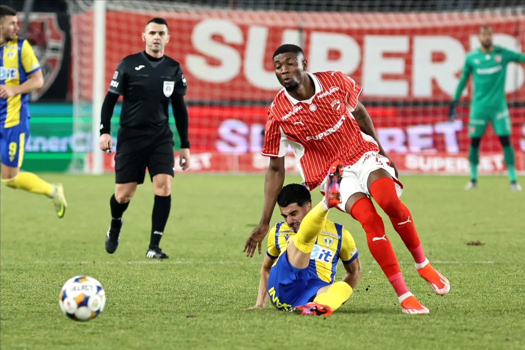 Kennedy Boateng (D), de la echipa Dinamo, lupta pentru balon cu Valentin Gheorghe (S), de la echipa Marco Dulca, in meciului din etapa 24 a Superligii, disputat pe stadionul Arcul de Triumf din Bucuresti, vineri, 30 ianuarie 2026. GEORGE FLUSTER / MEDIAFAX FOTO