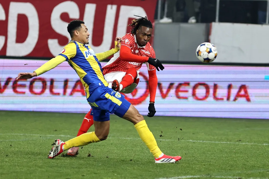 Mamoudou Karamoko (D), de la echipa Dinamo, lupta pentru balon cu Yohan Roche (S), de la echipa Marco Dulca, in meciului din etapa 24 a Superligii, disputat pe stadionul Arcul de Triumf din Bucuresti, vineri, 30 ianuarie 2026. GEORGE FLUSTER / MEDIAFAX FOTO