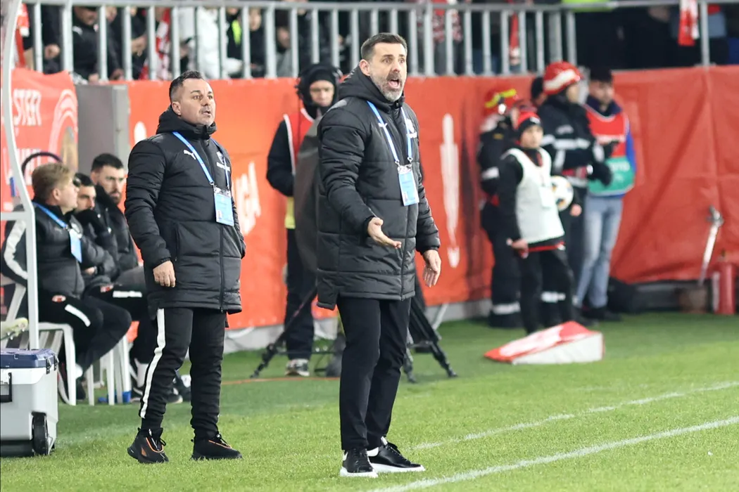 Zeljko Kopic (D), antrenorul echipei Dinamo si Florentin Petre (S), urmaresc meciul cu echipa FC Petrolul, din etapa 24 a Superligii, disputat pe stadionul Arcul de Triumf din Bucuresti, vineri, 30 ianuarie 2026. GEORGE FLUSTER / MEDIAFAX FOTO