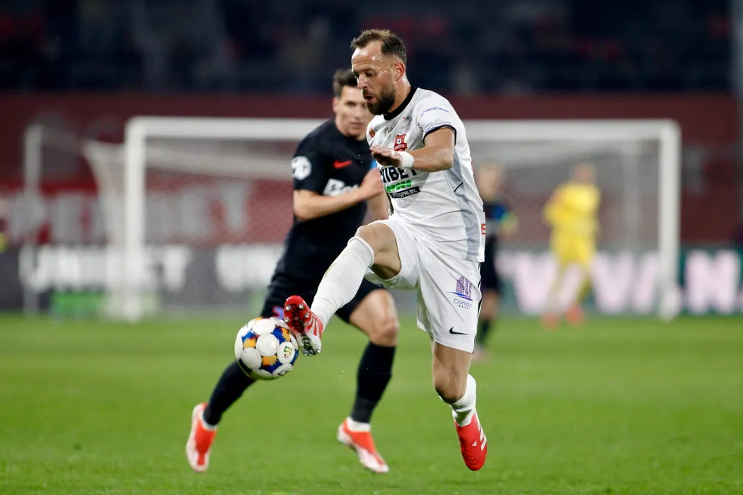 Cristian Negut, de la AFC Hermannstadt, suteaza in timpul meciului de fotbal contra echipei FCSB din etapa a 16-a a Superligii, disputat pe stadionul Municipal din Sibiu, duminica, 9 noiembrie 2025. OVIDIU MATIU / MEDIAFAX FOTO