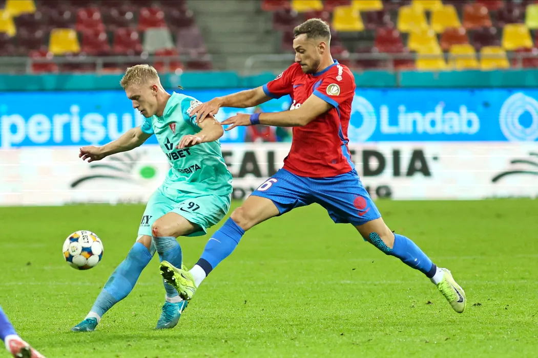 Mihai Lixandru (D), de la FCSB, lupta pentru balon cu Denis Hrezdac (S), de la UTA Arad, in timpul meciului de fotbal din etapa a XIV-a a Superligii, disputat pe Arena Nationala din Bucuresti, duminica, 26 octombrie 2025. GEORGE FLUSTER / MEDIAFAX FOTO