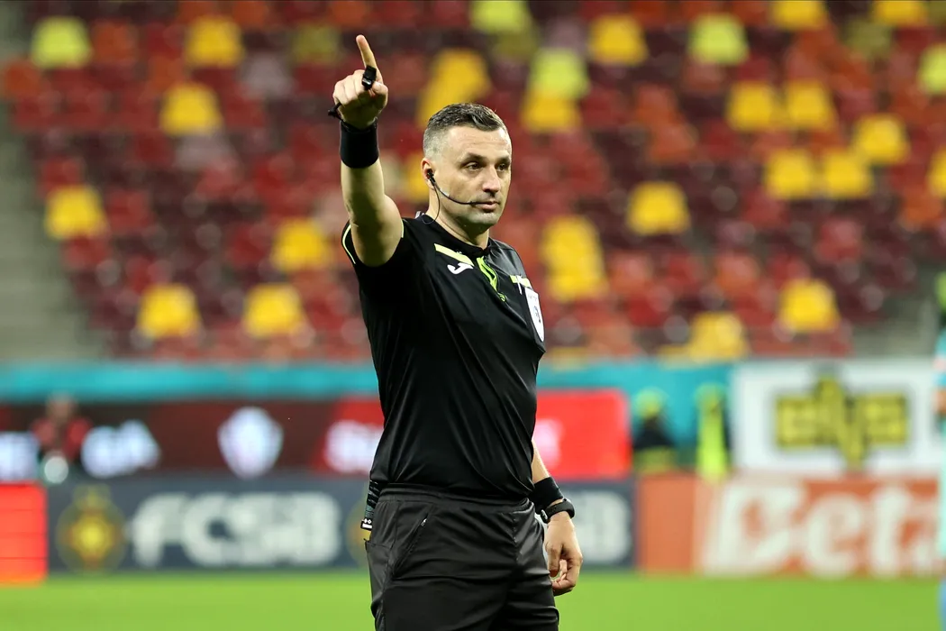Arbitrul Andrei Moroita conduce meciul de fotbal dintre FCSB si UTA Arad, din etapa a XIV-a a Superligii, disputat pe Arena Nationala din Bucuresti, duminica, 26 octombrie 2025. GEORGE FLUSTER / MEDIAFAX FOTO