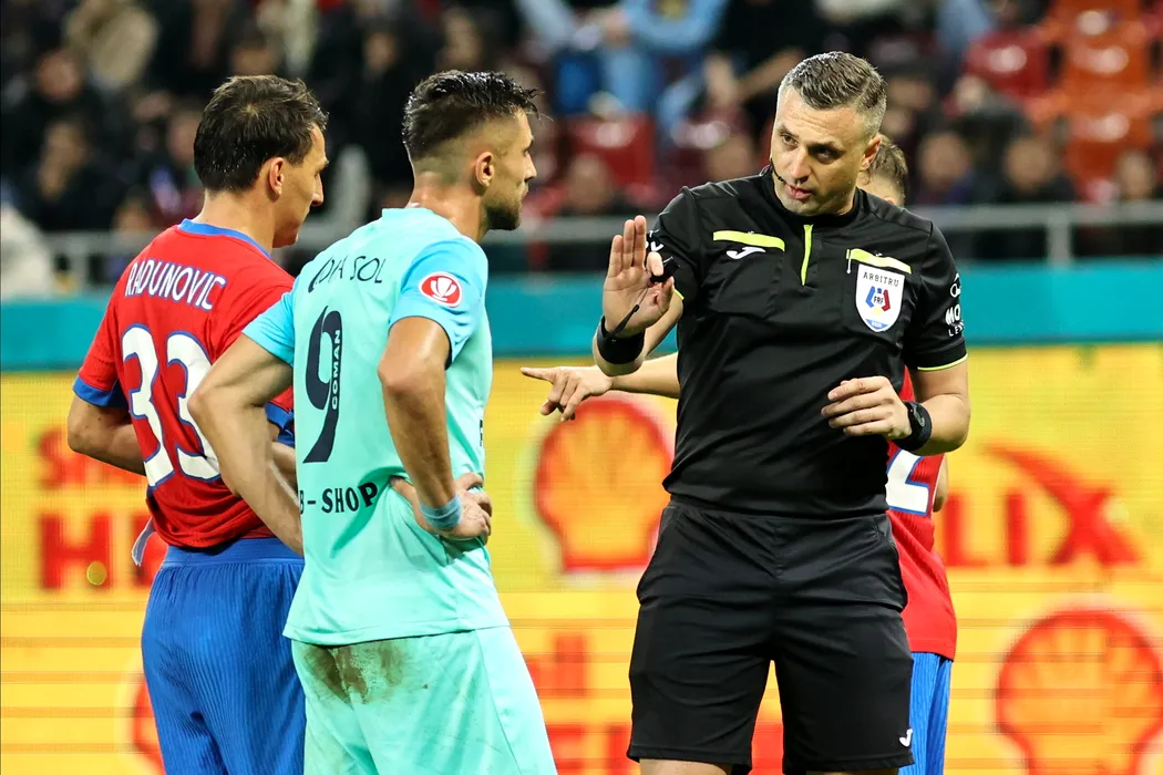 Arbitrul Andrei Moroita conduce meciul de fotbal dintre FCSB si UTA Arad, din etapa a XIV-a a Superligii, disputat pe Arena Nationala din Bucuresti, duminica, 26 octombrie 2025. GEORGE FLUSTER / MEDIAFAX FOTO