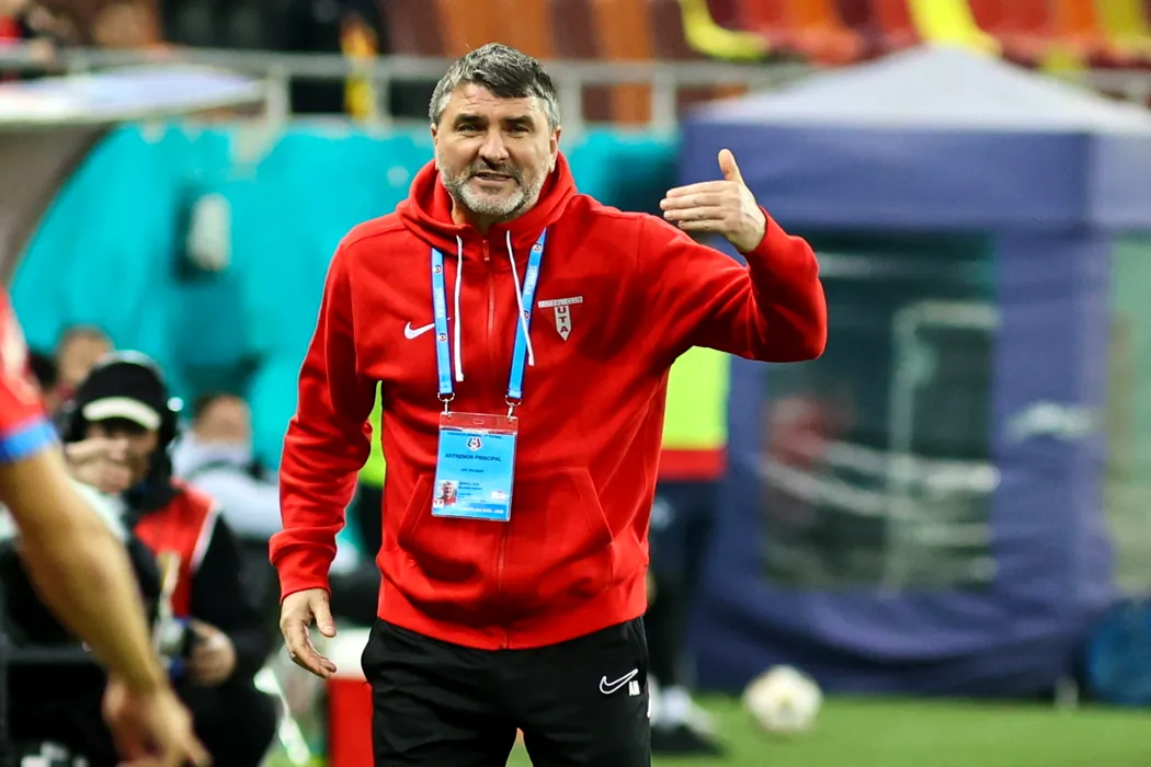 Adrian Mihalcea, antrenorul echipei UTA Arad, urmareste meciul de fotbal contra formatiei FCSB din etapa a XIV-a a Superligii, disputat pe Arena Nationala din Bucuresti, duminica, 26 octombrie 2025. GEORGE FLUSTER / MEDIAFAX FOTO