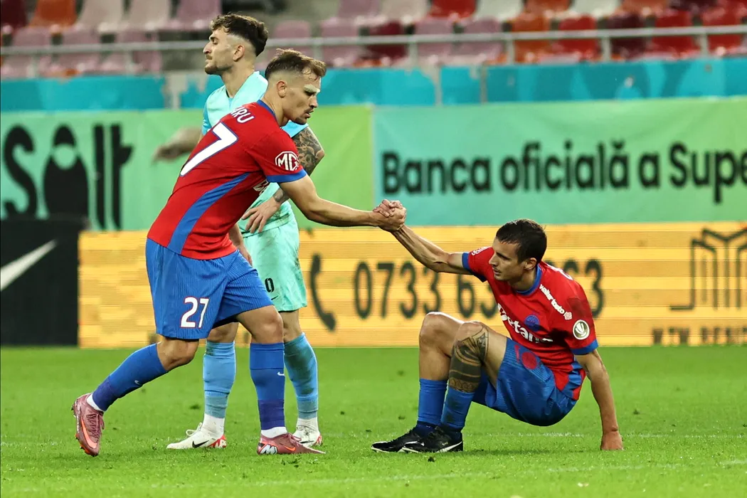 Meciul de fotbal dintre FCSB si UTA Arad, din etapa a XIV-a a Superligii, disputat pe Arena Nationala din Bucuresti, duminica, 26 octombrie 2025. In imagine: Darius Olaru (S) si Juri Cisotti. GEORGE FLUSTER / MEDIAFAX FOTO