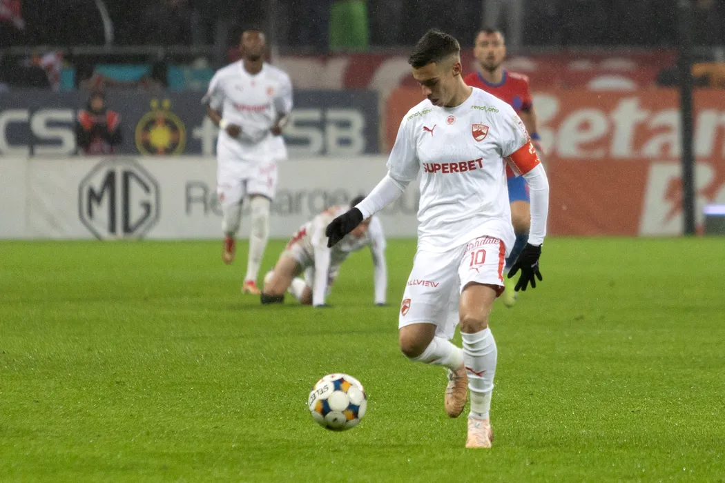 Catalin Cirjan, de la Dinamo, suteaza in timpul meciului de fotbal contra echipei FCSB din etapa a XIX-a a Superligii, disputat pe Arena Nationala din Bucuresti, sambata, 6 decembrie 2025. ALEXANDRA PANDREA / GMN / MEDIAFAX FOTO