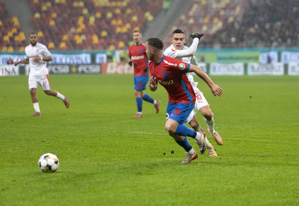 Mihai Toma (S), de la FCSB, lupta pentru balon cu Catalin Cirjan (D), de la Dinamo, in timpul meciului de fotbal din etapa a XIX-a a Superligii, disputat pe Arena Nationala din Bucuresti, sambata, 6 decembrie 2025. ALEXANDRA PANDREA / GMN / MEDIAFAX FOTO