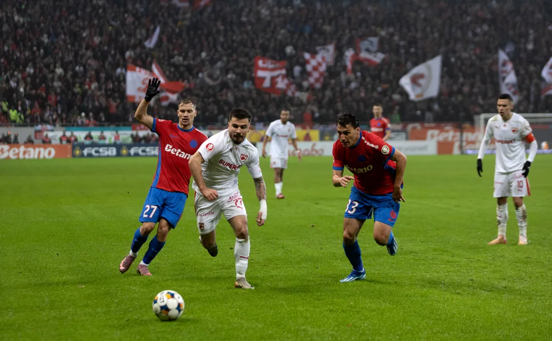 Darius Olaru (S) si Risto Radunovici (D), de la FCSB, lupta pentru balon cu Danny Armstrong (C), de la Dinamo in timpul meciului de fotbal din etapa a XIX-a a Superligii, disputat pe Arena Nationala din Bucuresti, sambata, 6 decembrie 2025. ALEXANDRA PANDREA / GMN / MEDIAFAX FOTO