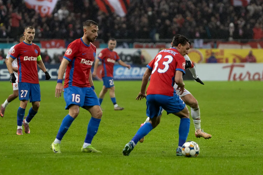 Risto Radunovici (D), de la FCSB, suteaza in timpul meciului de fotbal contra echipei Dinamo din etapa a XIX-a a Superligii, disputat pe Arena Nationala din Bucuresti, sambata, 6 decembrie 2025. ALEXANDRA PANDREA / GMN / MEDIAFAX FOTO