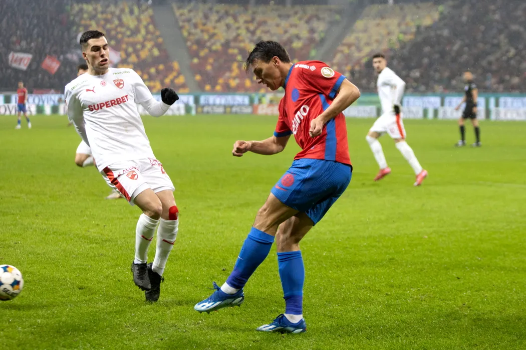 Risto Radunovici (D), de la FCSB, suteaza in timpul meciului de fotbal contra echipei Dinamo din etapa a XIX-a a Superligii, disputat pe Arena Nationala din Bucuresti, sambata, 6 decembrie 2025. ALEXANDRA PANDREA / GMN / MEDIAFAX FOTO