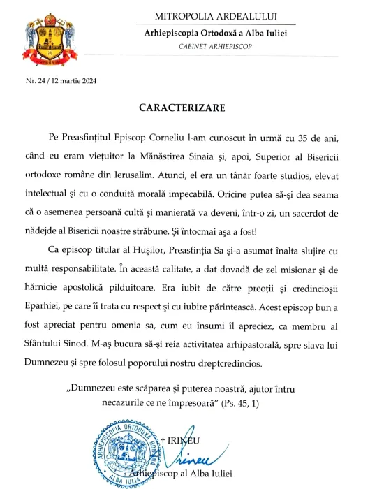 Trei ierarhi ai BOR au trimis instanței scrisori de caracterizare, în bunul stil comunist, prin care încercau să-l reabiliteze pe decăzutul episcop al Hușilor, Cornel Onilă / „Bună colaborare pe linie duhovnicească”