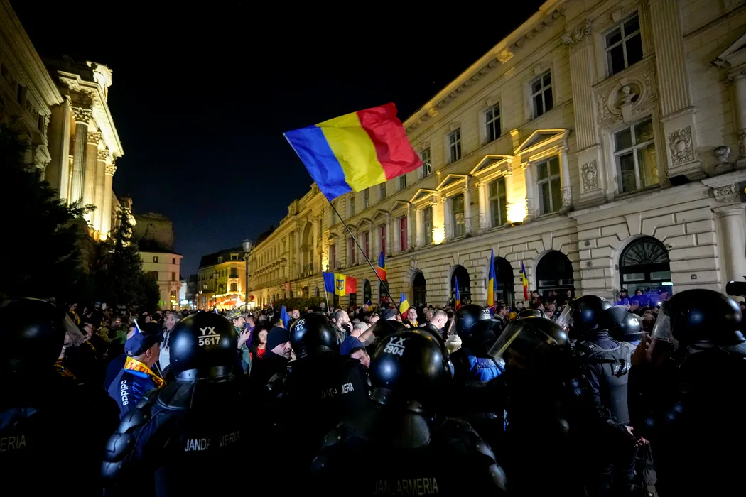 Jandarmi asigura ordinea in fata sediului Biroului Electoral Central din Bucuresti, unde sustinatori ai candidatului independent la presedintie, Calin Georgescu, protesteaza impotriva deciziei de invalidare a dosarului de candidat la alegerile prezidentiale, duminica, 9 martie 2025. ANDREEA ALEXANDRU / MEDIAFAX FOTO