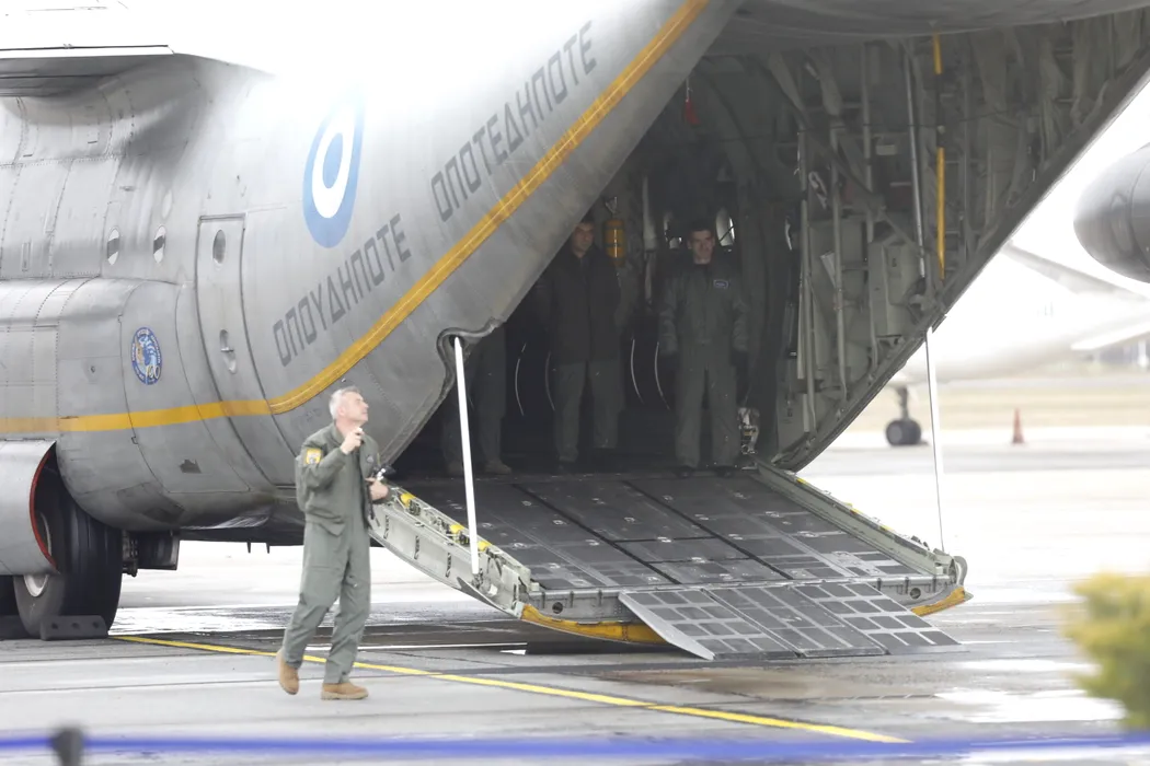 Trupurile neinsufletite ale celor sapte suporteri greci sunt repatriate de pe Aeroportul International Traian Vuia, cu un zbor special al Fortelor Aeriene Elene, dupa accidentul rutier produs in judetul Timis, joi, 29 ianuarie 2026. EMANUEL TITUS ILIESI / MEDIAFAX FOTO
