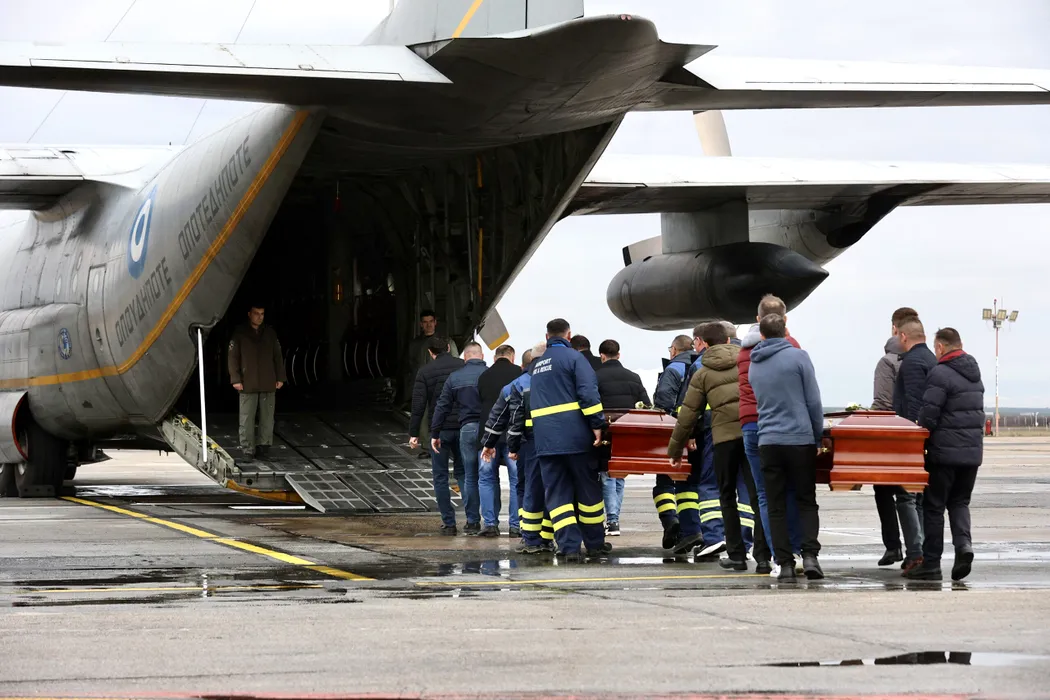 Trupurile neinsufletite ale celor sapte suporteri greci sunt repatriate de pe Aeroportul International Traian Vuia, cu un zbor special al Fortelor Aeriene Elene, dupa accidentul rutier produs in judetul Timis, joi, 29 ianuarie 2026. DANI AMARIEI / MEDIAFAX FOTO