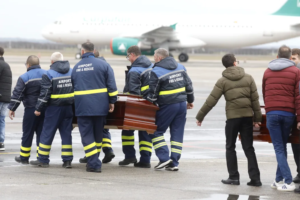 Trupurile neinsufletite ale celor sapte suporteri greci sunt repatriate de pe Aeroportul International Traian Vuia, cu un zbor special al Fortelor Aeriene Elene, dupa accidentul rutier produs in judetul Timis, joi, 29 ianuarie 2026. EMANUEL TITUS ILIESI / MEDIAFAX FOTO