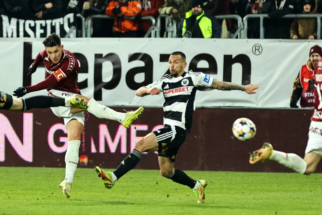 Alexandru Mihai Dobre (S), de la Rapid, suteaza in timpul meciului de fotbal contra echipei Universitatea Cluj, din etapa a XXIV-a a Superligii, disputat pe stadionul Rapid-Giulesti din Bucuresti, sambata, 31 ianuarie 2026. GEORGE FLUSTER / MEDIAFAX FOTO