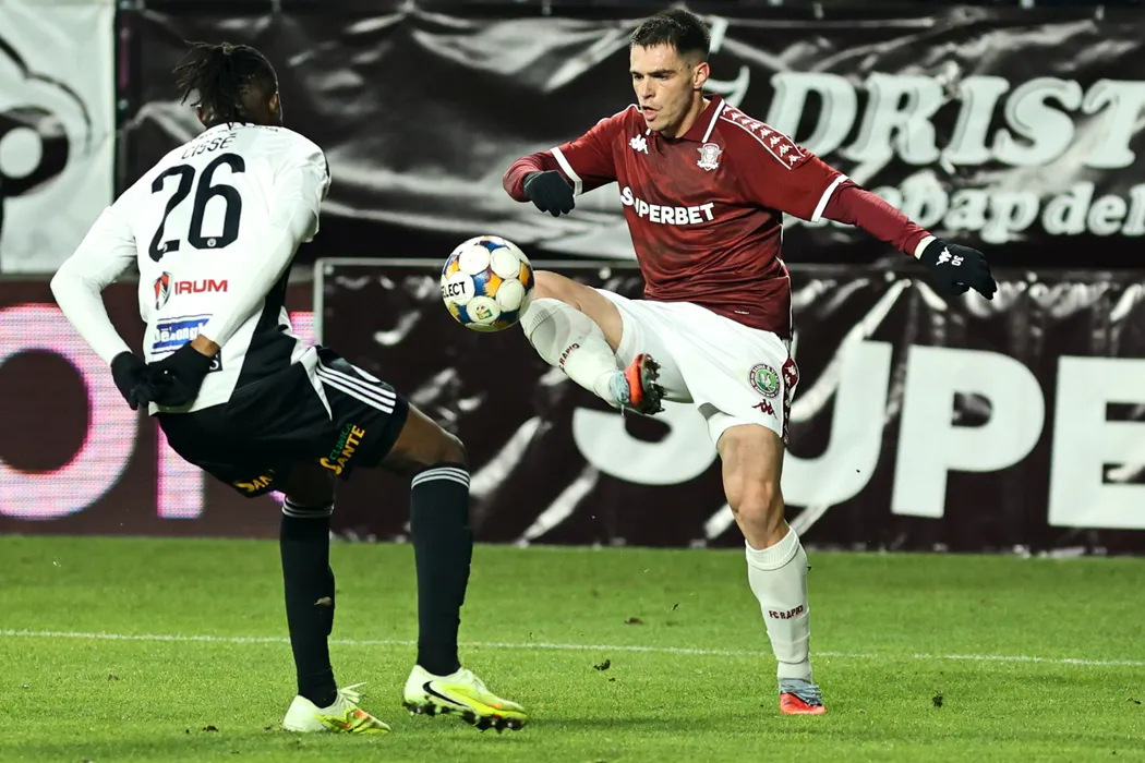 Daniel Paraschiv (D), de la Rapid, lupta pentru balon cu Jonathan Cisse (S), de la Universitatea Cluj, in timpul meciului de fotbal din etapa a XXIV-a a Superligii, disputat pe stadionul Rapid-Giulesti din Bucuresti, sambata, 31 ianuarie 2026. GEORGE FLUSTER / MEDIAFAX FOTO