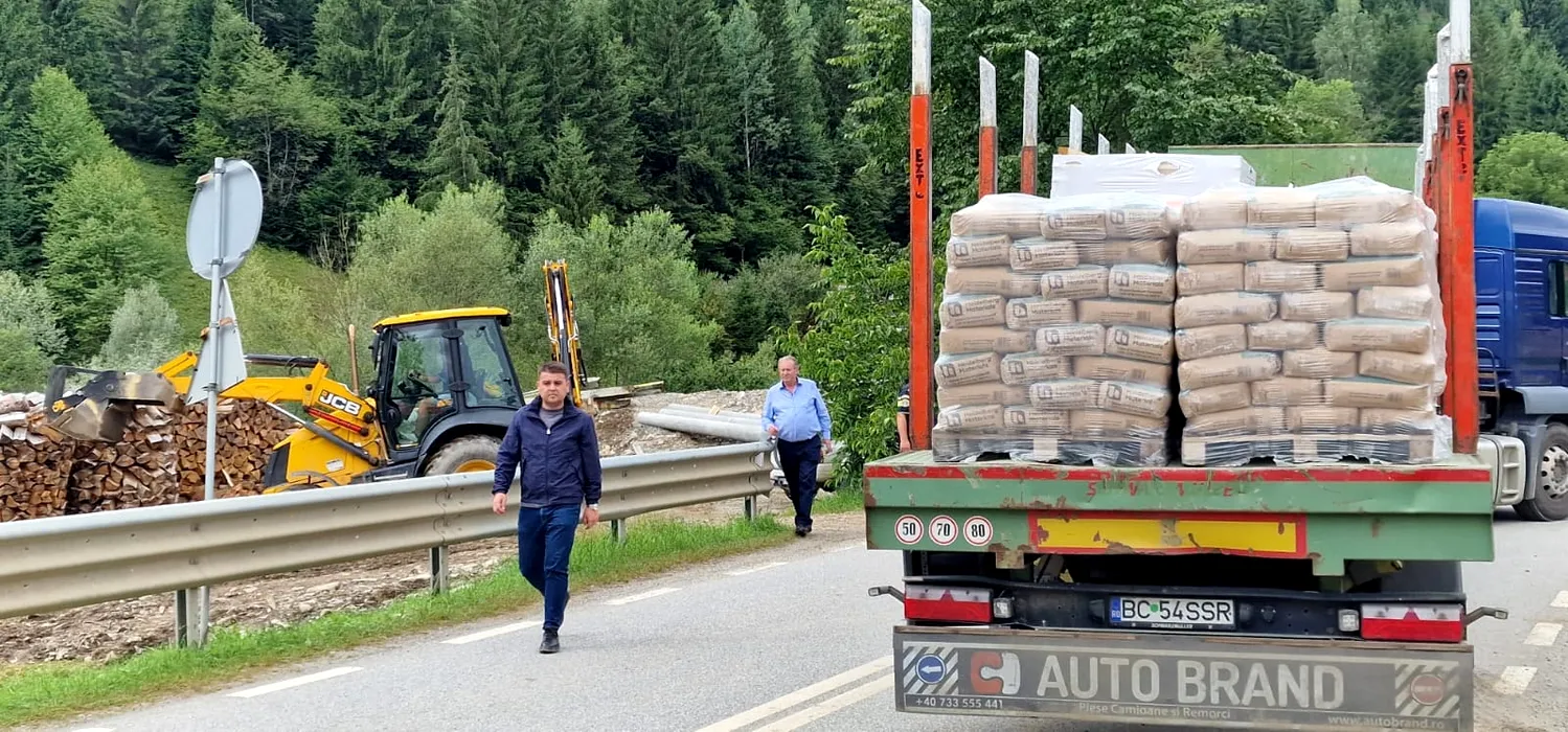 Un convoi de cinci tiruri şi mai multe camioane cu materiale de construcţii şi electrocasnice a ajuns în Broșteni