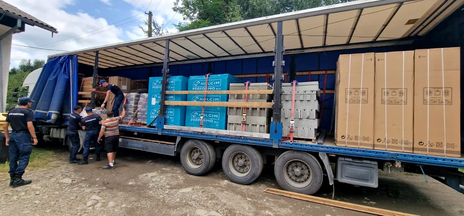 Un convoi de cinci tiruri şi mai multe camioane cu materiale de construcţii şi electrocasnice a ajuns în Broșteni