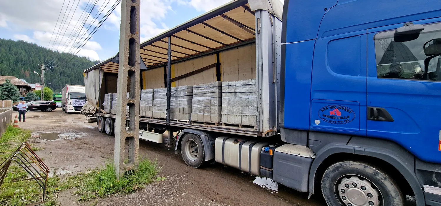 Un convoi de cinci tiruri şi mai multe camioane cu materiale de construcţii şi electrocasnice a ajuns în Broșteni