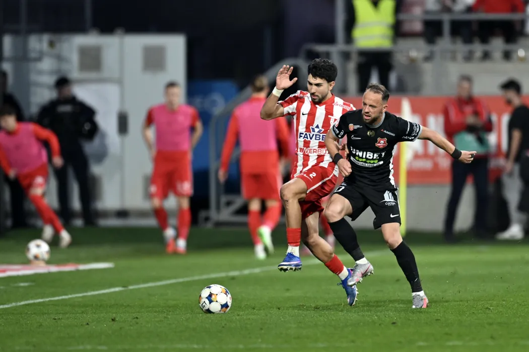 Tutu Mark (S) de la echipa UTA Arad lupta pentru balon cu Negut Cristian Daniel (D) de la FC Hermannstadt, in meciul care deschide play-out-ul Superligii, disputat pe Arena Francisc Neuman din Arad, vineri, 13 martie 2026. LECKZI JOSZI / MEDIAFAX FOTO
