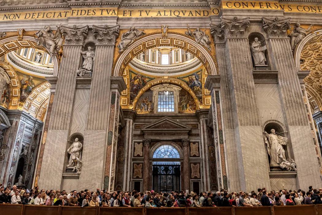 23 April 2025, Vatican, Vatican City: People queue to pay respects as the body of Pope Francis lies in state inside St. Peter's Basilica. The Argentine pontiff, who led the Catholic Church from 2013, passed away on Easter Monday at the age of 88, leaving a lasting legacy and a profound impact on millions around the world. Photo: Oliver Weiken/dpa