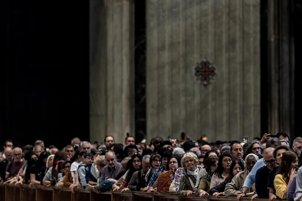 23 April 2025, Vatican, Vatican City: People queue to pay respects as the body of Pope Francis lies in state inside St. Peter's Basilica. The Argentine pontiff, who led the Catholic Church from 2013, passed away on Easter Monday at the age of 88, leaving a lasting legacy and a profound impact on millions around the world. Photo: Oliver Weiken/dpa