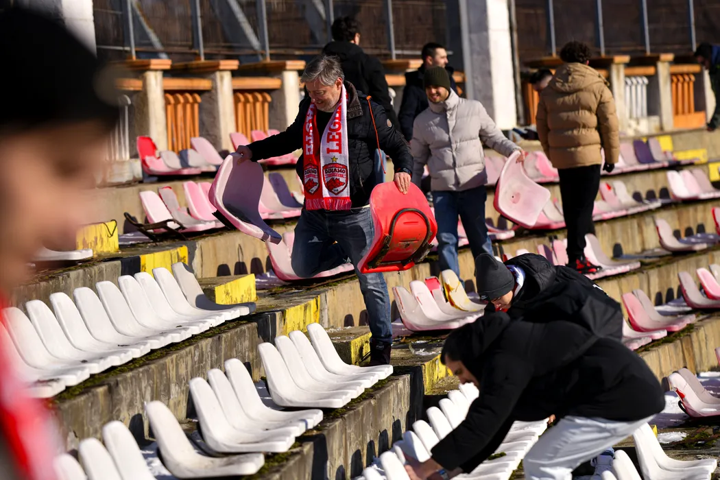 Suporterii isi iau cate un scaun amintire la evenimentul de incepere a demolarii Stadionului Dinamo din Bucuresti, marti, 20 ianuarie 2026. ALEXANDRU DOBRE / MEDIAFAX FOTO