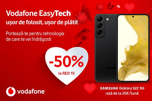 Vodafone reconfirmă promisiunea de a oferi românilor tehnologie de ultimă generaţie, uşor de găsit, uşor de plătit şi uşor de folosit, prin EasyTech. Clienţii care se portează în reţeaua Vodafone au 50% reducere la abonamentele RED 15 sau RED Infinity 23 pe toată perioada contractuală şi super preţuri la smartphone-urile Samsung, Apple, Xiaomi sau Huawei pentru a duce tehnologia pe care o îndrăgesc celor pe care îi iubesc.