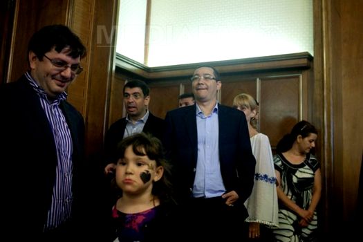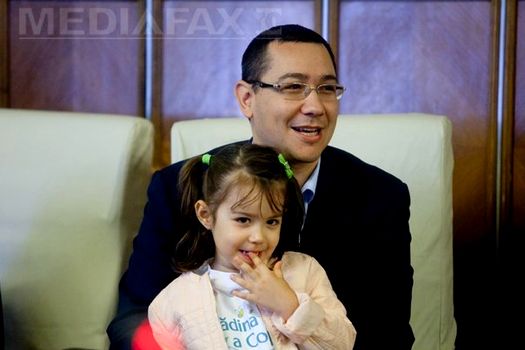 Premierul a intrat în această lume a copiilor însoţit de soţia sa, Daciana Sârbu, şi fiica Irina şi s-a fotografiat cu cei prezenţi, a citit dorinţele, a privit desenele şi a asistat la jocuri cu mingea.