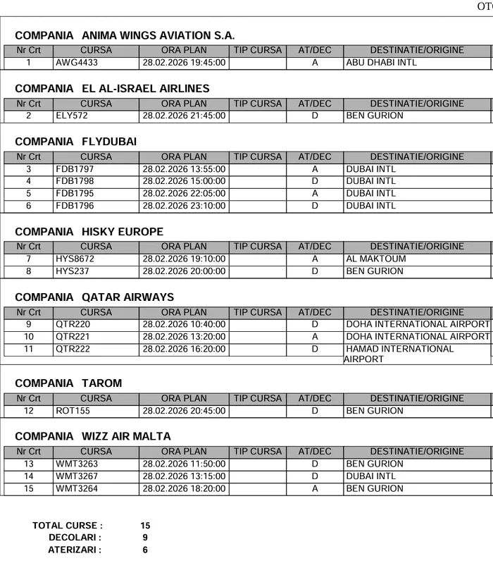 12 zboruri către Tel Aviv, Dubai și Abu Dhabi au fost anulate pe Otopeni. Peste 1.500 de pasageri sunt afectați.