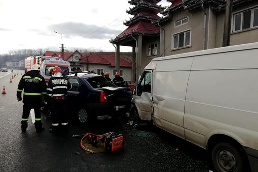 În urma impactului dintre un autoturism şi o autoutilitară care transporta sicrie, trei persoane, două femei şi un bărbat, au suferit răni grave.