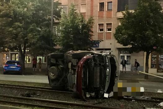 Microbuzul a pătruns pe terasamentul liniilor de tramvai, unde s-a lovit de un stâlp de înaltă tensiune.