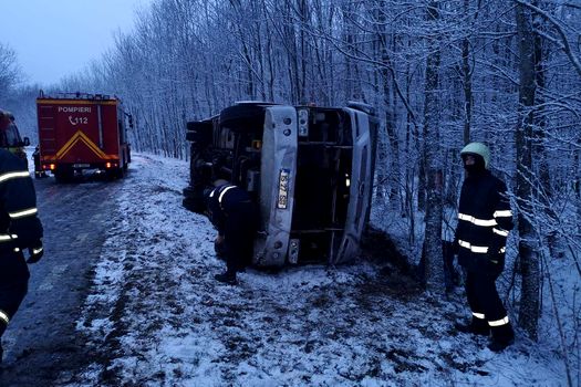 Microbuzul cu 23 de persoane care s-a răsturnat în zona localităţii Dobrovăţ, judeţul Iaşi, circula cu viteză pe un drum acoperit cu zăpadă. 23 de oameni sunt la spital.