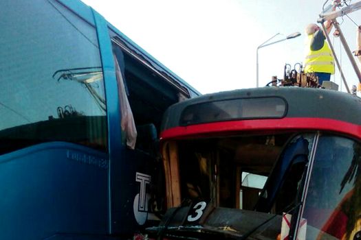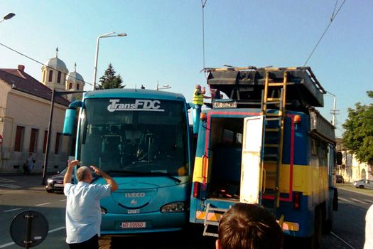 Garnitura a lovit autocarul în lateral, autovehiculul fiind avariat.