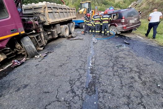 Potrivit primelor informaţii, în coliziune au fost implicate un autoturism şi un autotren care transporta un buldoexcavator.