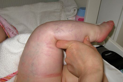 Bunica bebeluşului a remarcat în zona inghinală a acestuia o başicuţă „albăstruie mai evidentă”, iar în jurul datei de 29 noiembrie 2007, piciorul drept al fetiţei devenise mai umflat şi avea o coloratură mai aparte faţă de cel stâng. În 30 noiembrie, fetiţa ar fi fost văzută de un medic pediatru de la Medlife, care ar fi spus că este vorba despre un ganglion şi ar fi cerut să fie anunţată dacă situaţia se modifică.