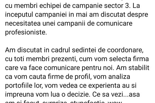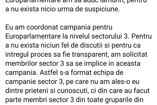 „Dragi colegi, pentru că au apărut discuţii şi s-au solicitat clarificări cu privire la modul în care filiala USR sector 3 a cheltuit banii in campania de europarlamentare am să aduc lămuriri, pntru a nu exista nicio urmă de suspiciune. Eu am coordonat campania pntru europarlamentare la nivelul sectorului 3. Pentru a nu exista niciun fel de discuţii şi pntru ca întrgul proces să fi transparent, am solicitat membrilor sector 3 să se împlice în campanie. Astfel s-a format echipa de campanie sector 3, pe care nu ales-o eu dintre prieteni şi cunoscuţi, ci din care au făcut parte membri sector 3 din toate grupările din partid şi vă mai spun ceva, am colaborat excelent”, a scris Teodora Stoian.