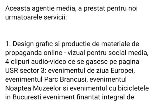 1 Design grafic şi producţie de material de propagandă online -vizual pentru social media, 4 clipuri audio-video ce se găsesc pe pagina USR sector 3: evenimntul de ziua Europei, evenimentul Parc Brâncuşi, evenimentul Noaptea Muzeelor şi evenimentul cu bicicletele în Bucureşti, eveniment finanţat integral de sector 3, la car un participat şi de care au beneficiat toate sectoarele.