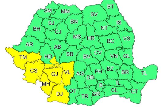 Meteorologii avertizează că în judeţele Mehedinţi, Gorj, Vâlcea, Dolj, Caraş-Severin, Timiş şi local în judeţul Hunedoara se vor semnala averse, iar în intervale scurte de timp sau prin acumulare se vor înregistra cantităţi de apă ce vor depăşi 25 l/mp şi pe arii restrânse 40-60 l/mp.