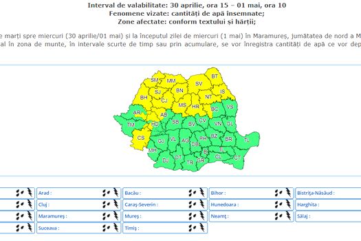 Meteorologii avertizează că în noaptea de marţi spre miercuri (30 aprilie/01 mai) şi la începutul zilei de miercuri (1 mai) în Maramureş, jumătatea de nord a Moldovei, Transilvaniei şi Crişanei şi local în zona de munte, în intervale scurte de timp sau prin acumulare, se vor înregistra cantităţi de apă ce vor depăşi 25 l/mp şi izolat 40-50 l/mp.