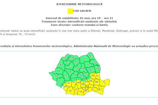 Cea de-a doua atenţionare meteorologică cod galben, de data aceasta de vânt puternic, intră în vigoare miercuri, 1 mai, la ora 10.00 şi expiră în aceeaşi zi, la ora 21.00.