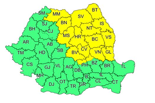 Avertizarea este în vigoare începând de marţi de la ora 13:00 până miercuri la ora 10:00, în judeţele Maramureş, Bistriţa-Năsăud, Harghita, Mureş, Braşov, Covasna, Prahova, Buzău, Suceava, Neamţ, Botoşani, Iaşi, Bacău, Vaslui, Vrancea şi Galaţi.