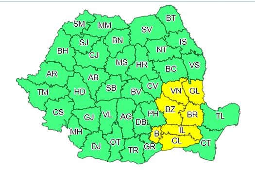 Începând de sâmbătă ora 14.00 până duminică la ora 10.00, este în vigoare o nouă atenţionare cod galben de polei şi depuneri de gheaţă în Bucureşti şi în judeţele Vrancea, Galaţi, Brăila, Buzău, Ilfov şi Călăraşi, conform căreia în după-amiaza şi seara zilei de sâmbătă vor mai fi precipitaţii slabe, predominat sub formă de ploaie, ce vor continua să depună polei, iar pe tot parcursul intervalului depunerile semnificative de gheaţă se vor menţine.