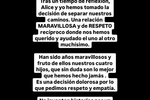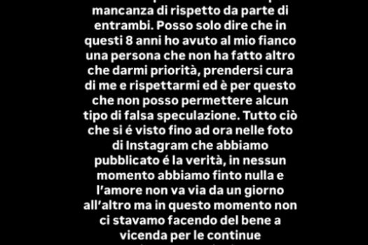 Italianca Alice, antreprenoare veneţiană şi bloggeriţă, a publicat pe Instagram: „Nu există nicio a treia persoană, îi mulţumesc lui Alvaro pentru soţul şi tatăl care a fost întotdeauna. Ne-am promis să nu devenim o relaţie toxică şi, având în vedere neînţelegerile actuale, nu vrem să ne rănim unul pe celălalt”.